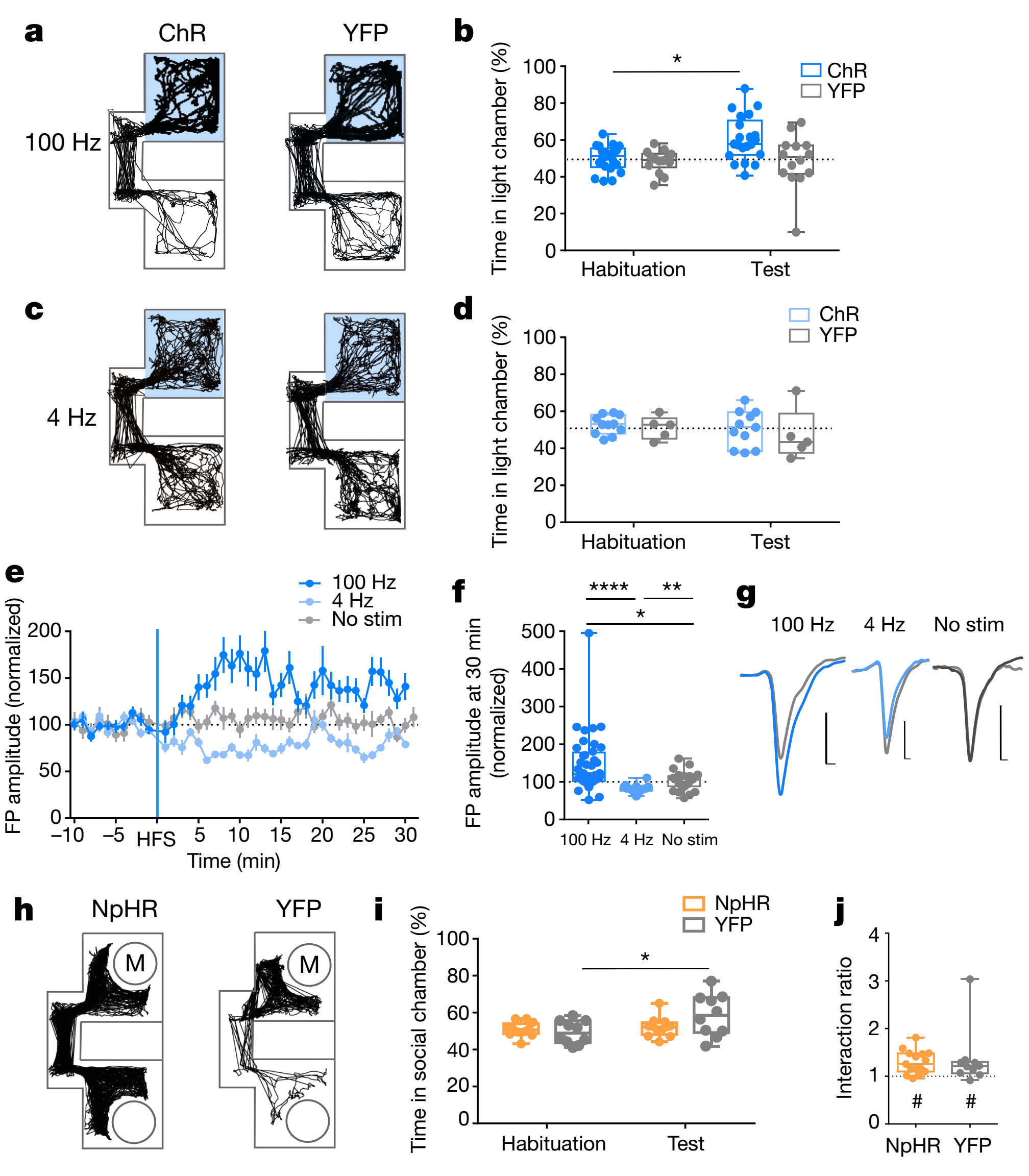 在了解高频刺激可诱发海马-伏隔核LTP之后,作者就其在体功能展开研究。他们在小鼠海马注射AAV-ChR2,在伏隔核双侧植入光纤,发现高频刺激诱导的海马-伏隔核LTP(图2e-g)可诱发小鼠产生条件位置偏好,而低频刺激无此现象(图2a-d)。