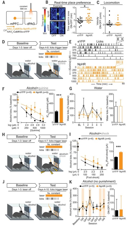 图2 初饮时mPFC-dPAG神经元活性可预知小鼠的酒精易感性 3.抑制mPFC-dPAG环路诱发强迫性酗酒行为接下来,为进一步探究mPFC-dPAG环路的功能,作者使用光遗传操控神经元手段。他们在小鼠的mPFC注射AAV-CaMKIIα-NpHR,在dPAG植入光纤,以实时位置偏好范式检测小鼠的偏好性行为(图3A-B)。他们发现,给予黄光抑制mPFC-dPAG环路,小鼠显著倾向于黄光一侧,而小鼠运动能力无明显变化(图3B-C)。他们还发现,光抑制mPFC-dPAG环路后,小鼠对掺奎宁酒精的摄入量显著增加,而摄水量不变(图3D-G)。此外,若在酒精出水管前给予足底电击刺激,抑制mPFC-dPAG环路后小鼠摄酒量显著增加;而在无足底电击条件下,抑制mPFC-dPAG环路后小鼠摄酒量不变(图3H-K)。