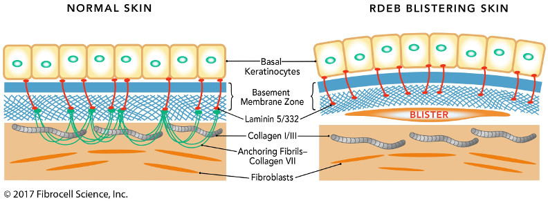 RDEB是一种罕见皮肤疾病,是一种以皮肤起水泡并累及全身为特征的严重威胁生命的遗传性皮肤疾病,会导致儿童过早死亡。RDEB患者的COL7A1基因有缺陷,使他们无法产生功能性的VII型胶原,而这种蛋白有助于赋予结缔组织结构和强度,是固定皮肤和表皮层所必需的。具体请看文章 )。