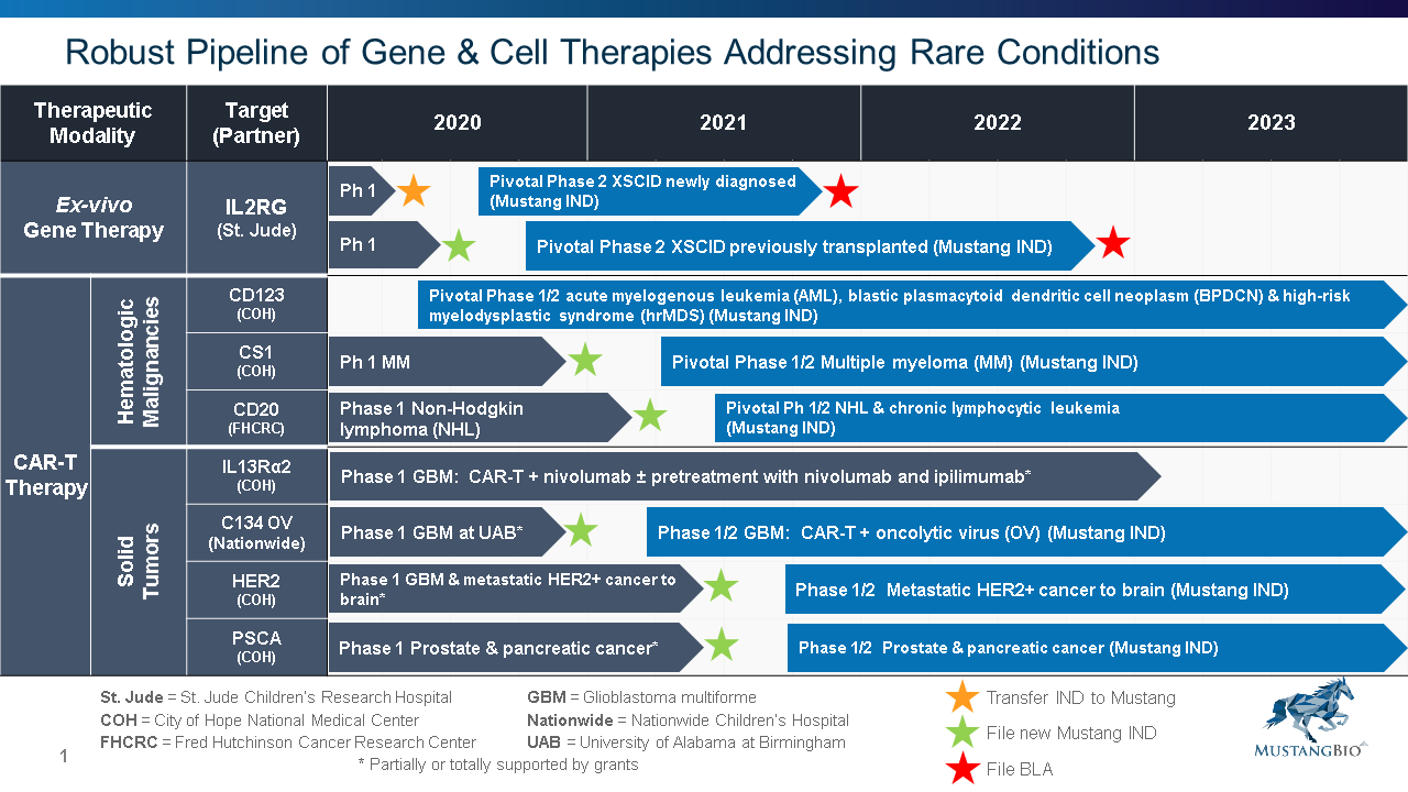 Mustang Bio是一家临床级生物制药公司,是Fortress Biotech的子公司。专注于将细胞和基因治疗方面的医学突破转化为临床应用疗法,他们重点关注血液肿瘤、实体肿瘤和罕见基因疾病的潜在方法。Mustang布局多个产品线,他们不断尝试通过授权或以其他方式获得所有权权益来获得上述细胞和基因治疗技术,为研究和开发提供资金,并通过授权或将这些技术推向市场。目前,Mustang已经与多家国际顶级医疗机构合作,推进CAR-T疗法在多种癌症中的应用,以及X-SCID的慢病毒基因疗法。