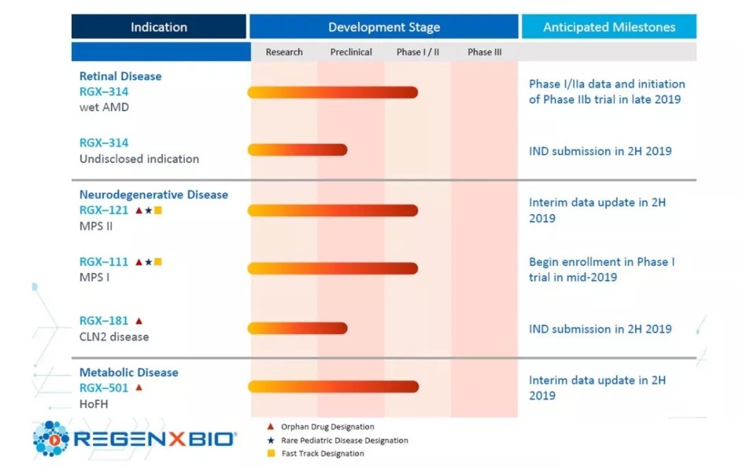 Regenxbio是一家临床阶段生物技术公司,致力于AAV基因疗法的开发和商业化。Regenxbio拥有的NAV技术平台是一个AAV基因递送技术平台,包括100多种新型AAV载体,比如AAV7、AAV8、AAV9和AAVrh10。除了进行内部开发之外,Regenxbio还将NAV技术平台授权许可给众多领先的生物技术公司。目前,已经有至少10家公司获得了NAV平台技术的许可并据此开发了超过20个候选产品。技术许可帮助Regenxbio更好地聚焦于内部产品线的开发并增加收入。