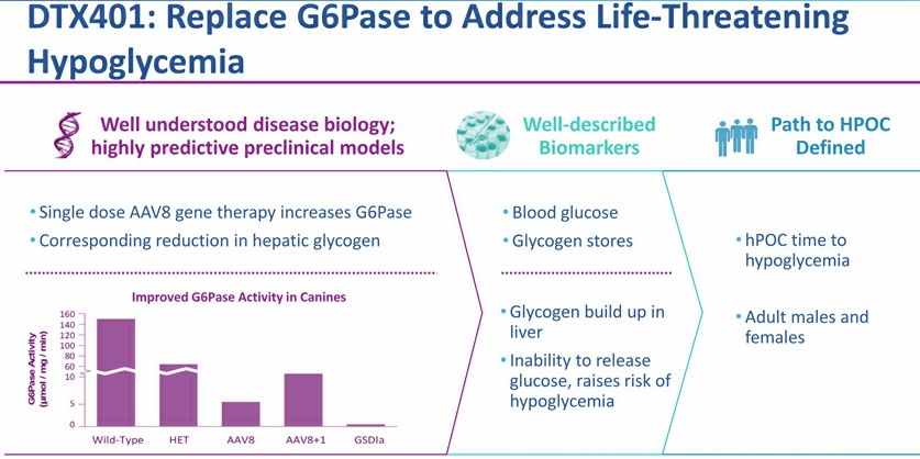 DTX401是Ultragenyx开发的试验性AAV8基因疗法,旨在提供稳定表达和有活性的G6Pase-α。在临床前试验中,DTX401作为一个单一静脉注射的基因疗法,已被证明可以修复G6Pase-α的活动,减少肝糖原的水平。DTX401被FDA和EMA授予孤儿药认定,在美国还被授予再生医学先进治疗疗法(RMAT)指定和快速通道指定。