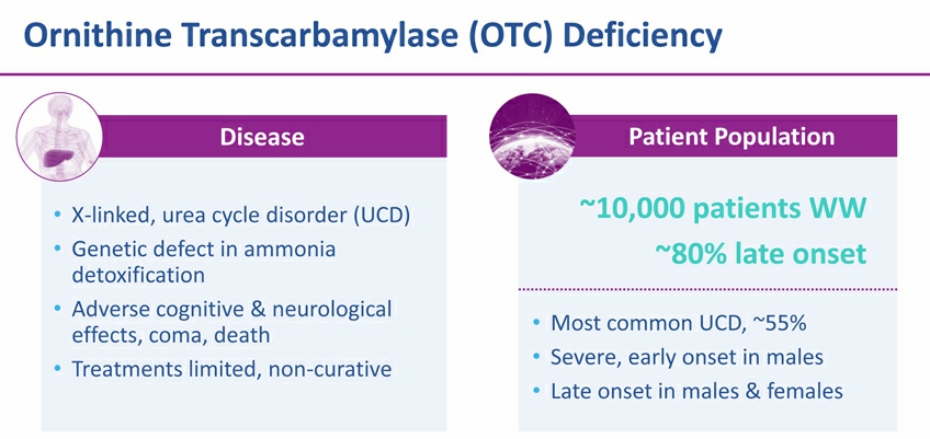 OTC缺乏症是最常见的尿素循环障碍,是由负责氨解毒的鸟氨酸转氨甲酰酶的遗传缺陷引起的。OTC缺乏症患者可在血液中积累过量的氨,从而可能导致急性和慢性神经功能障碍和其他毒性。据估计,全世界有超过10,000人受到OTC缺乏症的影响,其中约80%为晚发性。在该病的晚发形式中,氨氮升高可导致患者出现严重的医疗问题。新生儿发病疾病仅发生于男性,表现为严重疾病,可在早期死亡。目前临床应用的治疗手段必须要求患者一生中每天多次服用,且不能消除代谢风险,而唯一的根治方法是肝移植。