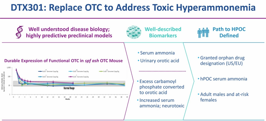Ultragenyx开发的DTX301是一种试验性的AAV 8型基因治疗疗法,在FDA和EMA都被列为孤儿药开发。DTX301的治疗原理在于单次静脉滴注后为患者提供稳定的OTC表达和活性。临床前研究提示,DTX301的体内使用可正常化尿中乳清酸(一种氨代谢的标记物)的水平。DTX301在美国和欧洲都被列为孤儿药。