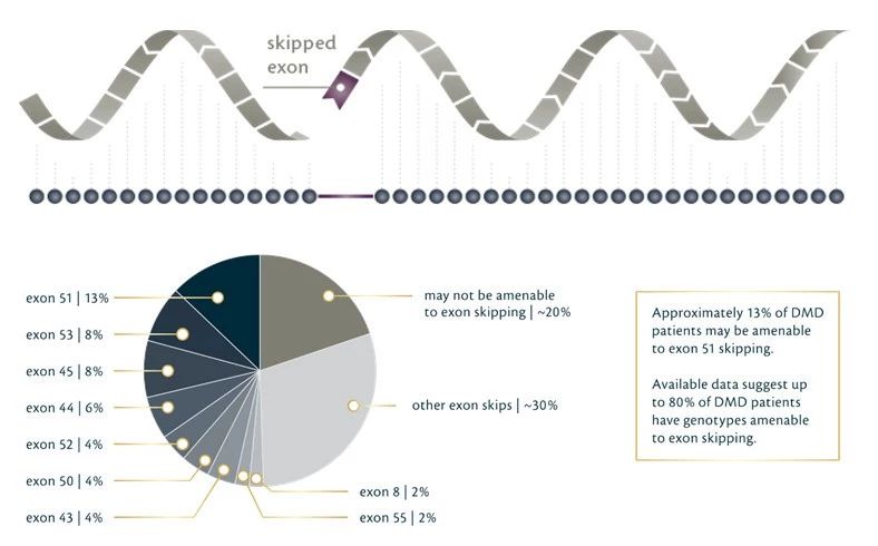 Exondys 51 (eteplirsen)是FDA批准的一种治疗方法,来自Sarepta,该疗法在DMD患者中跳过exon51,缓解DMD症状。