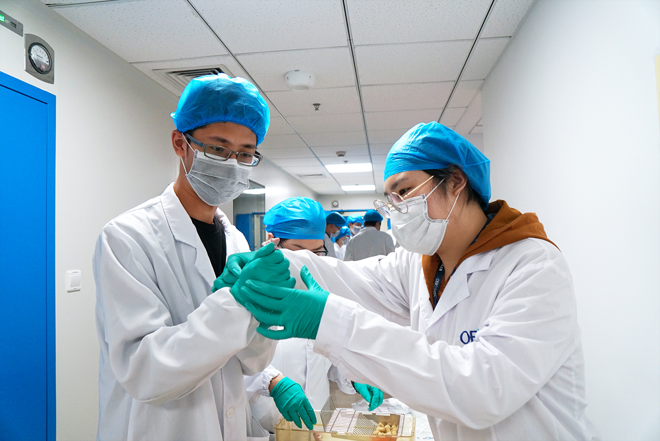 第二天上午进行的理论授课包括病毒在肿瘤和神经中的应用、肿瘤细胞培养、小动物成像技术、光遗传和光纤记录。这些干货内容帮助学员进一步了解实验的原理和方法。随后,下午的实验操作部分设置了两个专场,分别为肿瘤专场和神经专场,其中肿瘤专场实验包括肝原位成瘤、脑原位成瘤、皮下成瘤、肿瘤扦插和小动物成像技术,神经专场实验包括脑定位注射、视网膜注射、光遗传技术、光纤记录技术和插管鼠。各个专场的实验操作有条不紊地开展,大家的学习热情高涨,也不断和授课老师进行互动。专场外设置的答疑区更是大家实战练习的好去处。