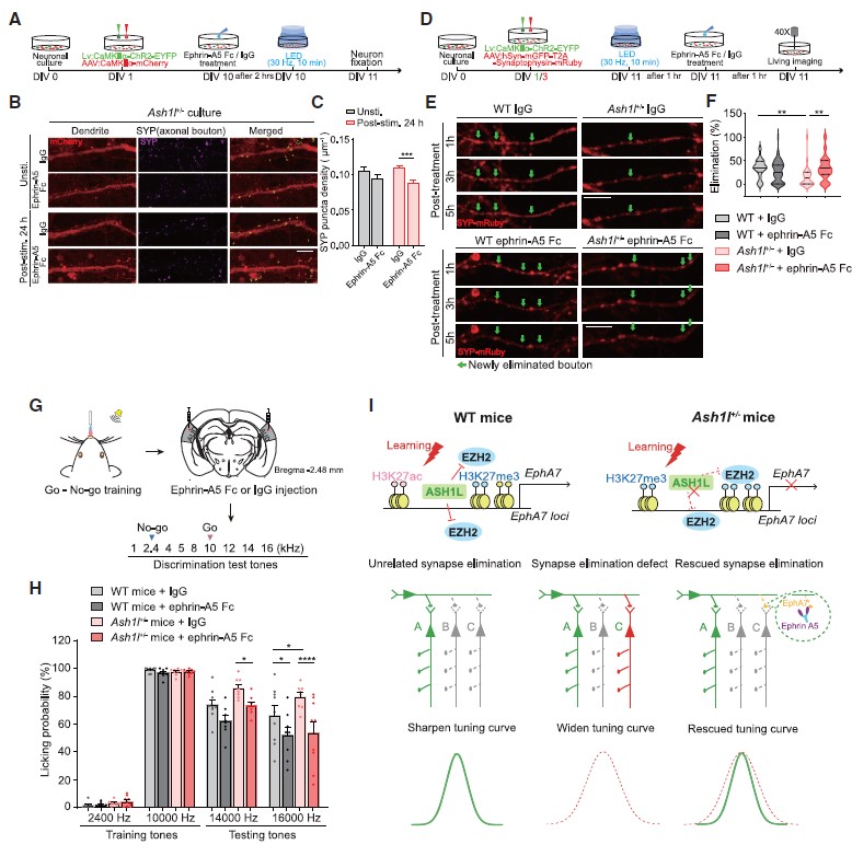随后,研究人员借助音调依赖的恐惧条件行为学范式,在体内/体外均发现Ash1l+/-小鼠听觉皮层活动依赖的神经元中EphA7表达远低于WT小鼠的(图4D-I),提示了在Ash1l+/-小鼠中EphA7活动诱导表达受损。