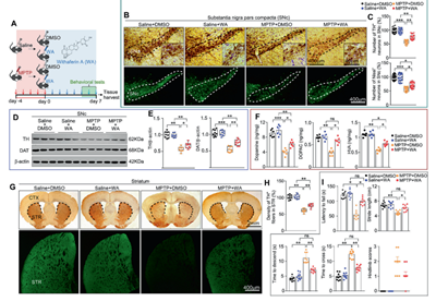 为了验证WA在帕金森病中发挥神经保护作用,研究者首先在MPTP诱导的帕金森小鼠模型中分别腹腔给予WA(或对照)处理。通过多种组织学和蛋白质印迹检测,发现相比给予溶剂对照,WA处理可以显著抑制帕金森模型鼠黑质-纹状体通路中多巴胺神经元的丢失。转棒、爬杆等行为学实验的结果表明,WA处理可以显著减轻帕金森模型动物的运动障碍症状(图1)。