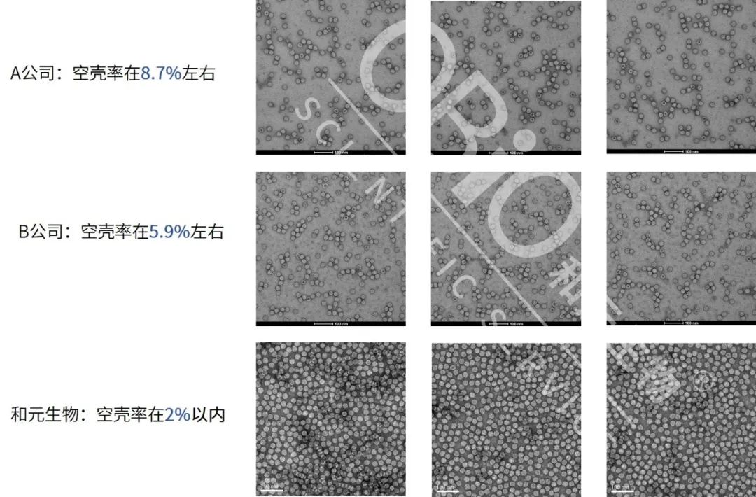 2021年,我们选择同一载体、不同生产厂商的腺相关病毒,发起了空壳率双盲测试,电镜结果显示,k8凯发(中国)天生赢家·一触即发 的腺相关病毒空壳率远低于行业一线品牌。