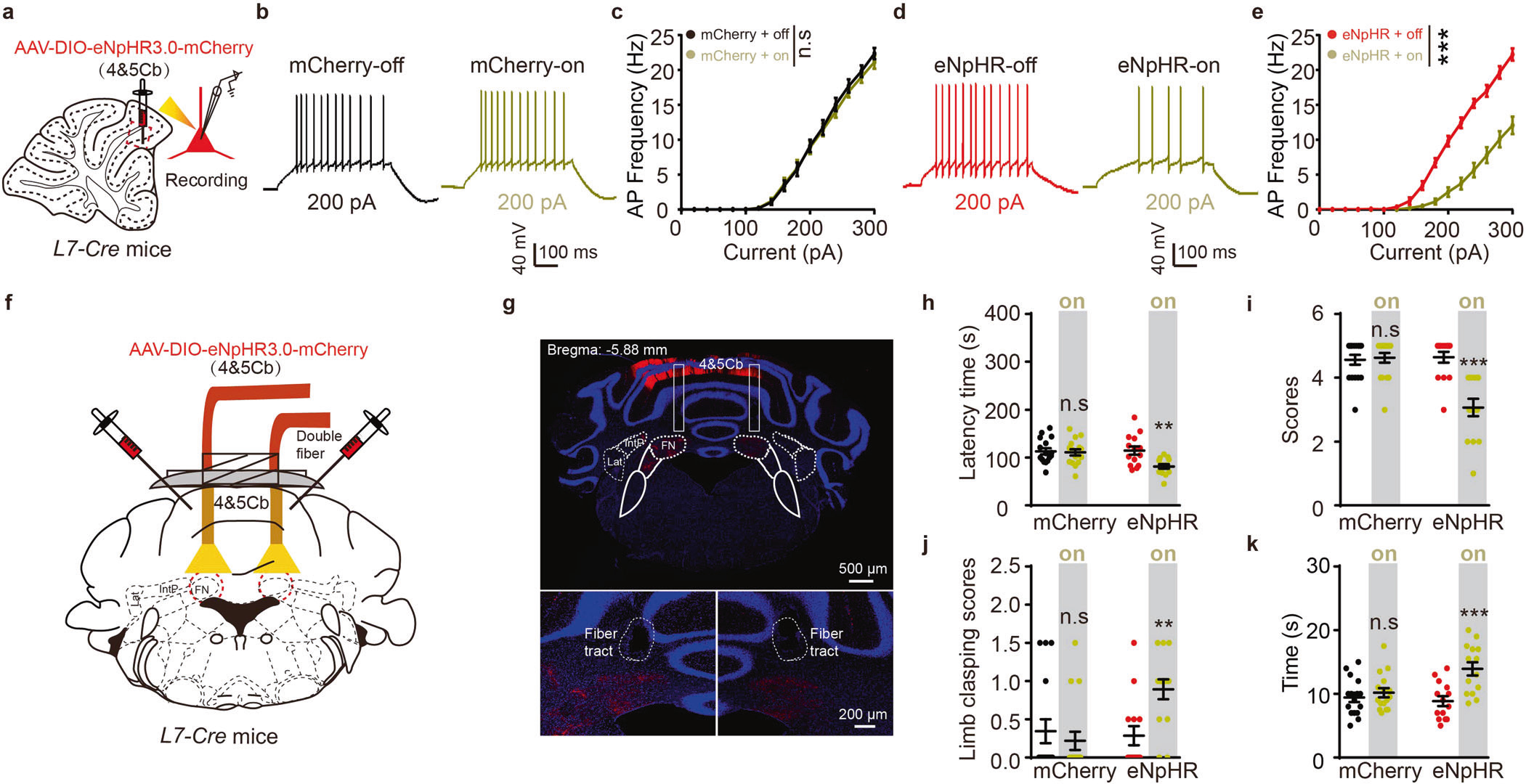 为研究IV/V叶—FN环路在运动相关行为中的作用,研究者在L7-Cre鼠IV/V叶注射AAV-DIO-eNpHR3.0-mCherry病毒,对脑片进行全细胞膜片钳记录发现,光遗传抑制降低了IV/V叶浦肯野细胞的放电速率(图2a-e)。此外,多种行为学结果显示,光遗传抑制IV/V叶在FN的投射末端可诱发小鼠共济失调样行为(图2h-k)。同时,作者借助化学遗传学技术进一步验证了特异性抑制IV/V叶浦肯野细胞,可导致FN CaMKIIα阳性神经元过度激活,从而损伤小鼠运动协调能力,产生共济失调样行为。