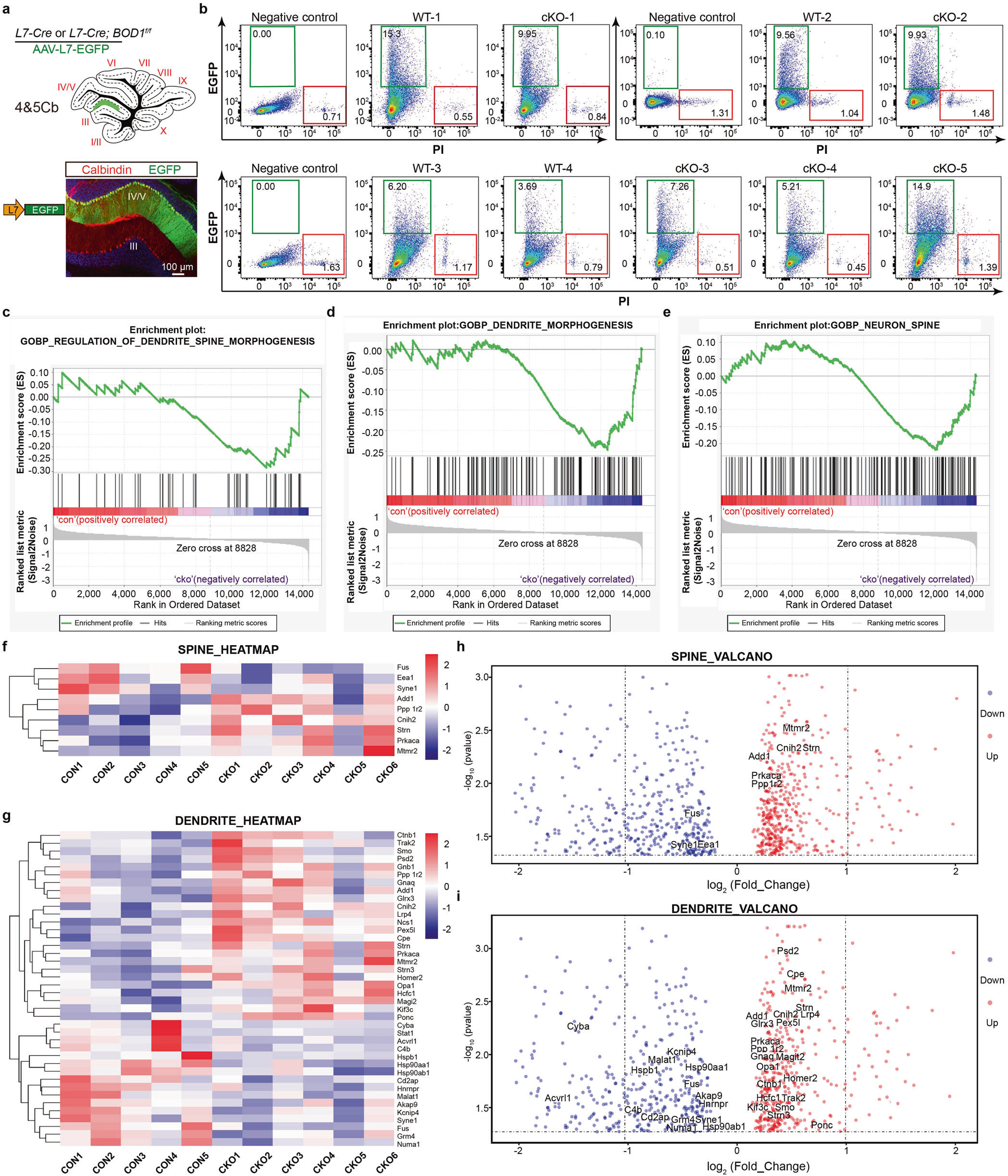 接下来,研究者借助稀疏标记病毒发现特异性敲除IV/V叶浦肯野神经元中BOD1可导致浦肯野细胞树突棘密度和树突分支明显降低。为研究其机制,作者分别在L7-Cre鼠和L7-Cre; BOD1f/f小鼠IV/V叶注射AAV-L7-EGFP,借助流式分选结合单细胞转录组分析发现,BOD1通过调节树突和树突棘相关基因影响浦肯野细胞树突形态发生改变(图5)。