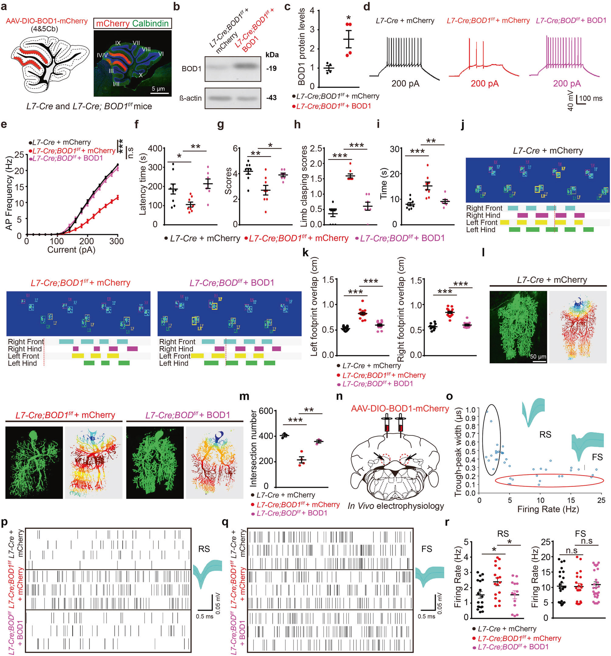 进一步,研究者借助AAV载体携带浦肯野细胞特异性启动子(AAV-L7-Cre-EGFP)条件性在小脑IV/V叶浦肯野细胞敲除BOD1,发现下调IV/V叶中BOD1的表达,可降低浦肯野细胞兴奋性,诱发小鼠表现出运动相关行为障碍(图4a-k)。