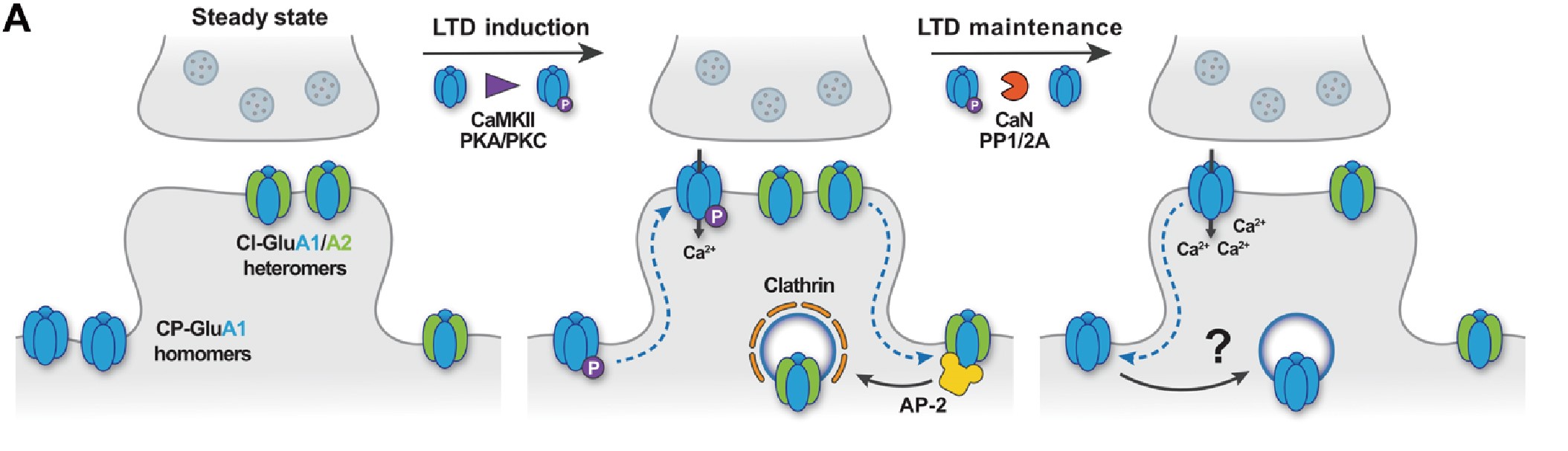 在LTD发生过程中,含有GluA1/A2异聚体的钙不通透性AMPAR(CI-AMPARs)会通过网格蛋白介导的内吞作用进行内化,而含有GluA1同聚体的钙通透性AMPAR(CP-AMPARs)先被招募到突触,介导了钙内流。在LTD维持阶段,这些CP-AMPARs最终需要被移除,然而移除机制暂不明确。
