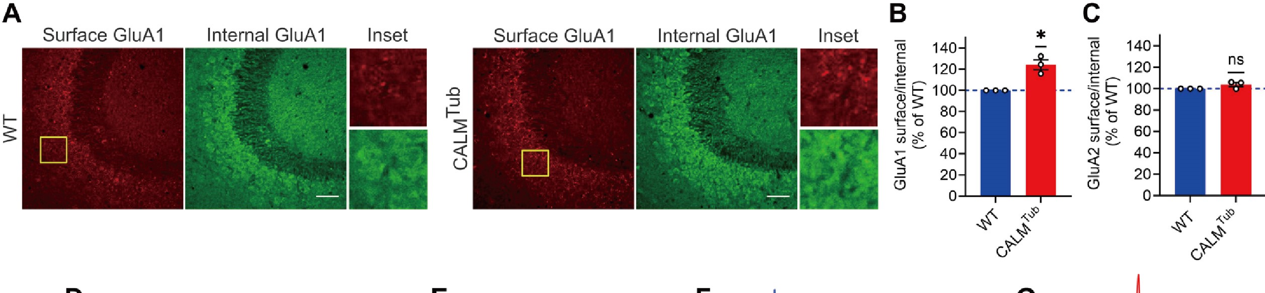 随后,特异性在皮层和海马兴奋性神经元中敲除CALM(CALM KOEMX小鼠)发现,经单次theta脉冲刺激(theta burst stimulation,TBS)后LTP显著增加;经低频刺激(LFS)诱导的LTD减少。免疫组化结果显示,特异性在皮层和海马兴奋性神经元中敲除CALM可导致部分含GluA1的AMPARs重新分配到神经元表面。