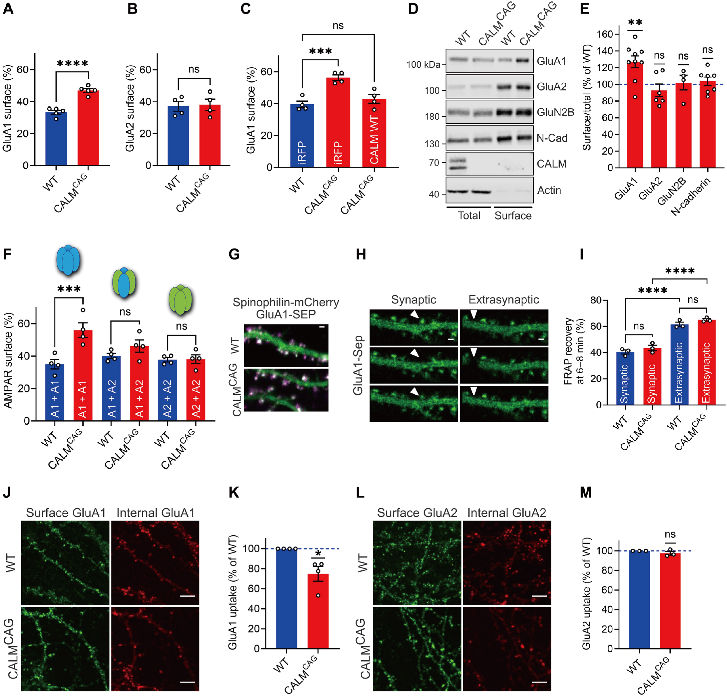 研究者借助AAV介导CALM在CALM敲除小鼠过表达,发现了CALM可特异性调控含GluA1的AMPARs表面水平。成像结果显示,CALM可选择性地促进GluA1在突触后膜的内吞作用,神经元缺失CALM则会导致海马神经元GluA1同体的内吞作用。提示了CALM通过选择性促进CP-AMPARs的内吞作用,在突触可塑性中起双向调控的作用。