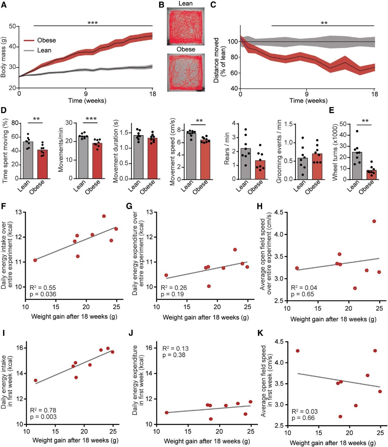 为了研究胖子为什么不喜欢运动,作者利用小鼠首先观察了高脂喂养诱导的肥胖小鼠和正常饮食小鼠运动情况,发现高脂喂养的肥胖小鼠运动明显减少(图1)。