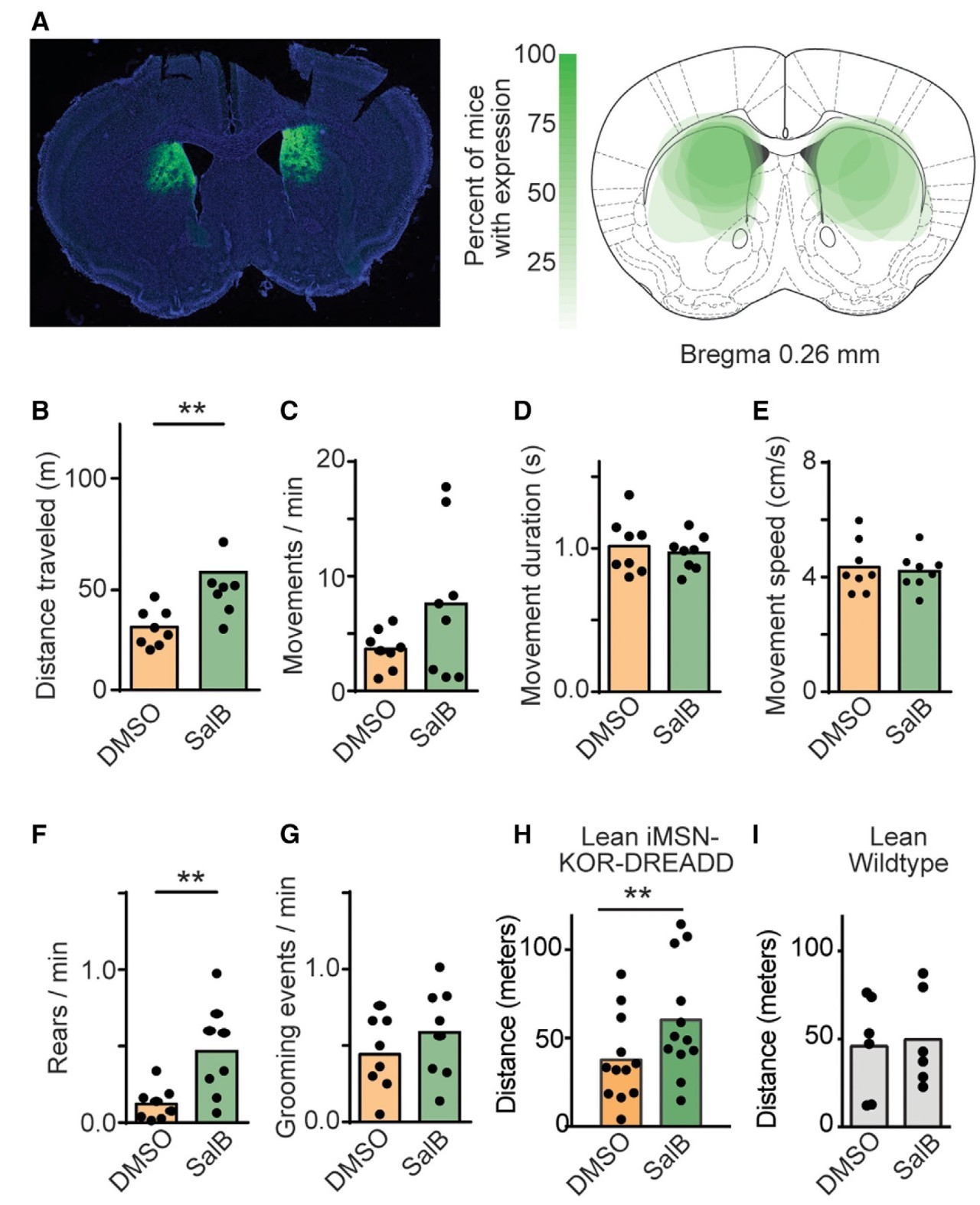 纹状体中受多巴胺调控的间接中多棘神经元(iMSNs)可以抑制D2R介导的信号,那么抑制iMSNs的信号输出是否可以逆转肥胖导致的小鼠运动减少呢?作者利用特异性的A2A-Cre和KOR-DREADD(化学遗传)对纹状体中的iMSNs实现特异的抑制,结果显示肥胖小鼠和正常小鼠的运动都得到了增强(图4B-4I)。