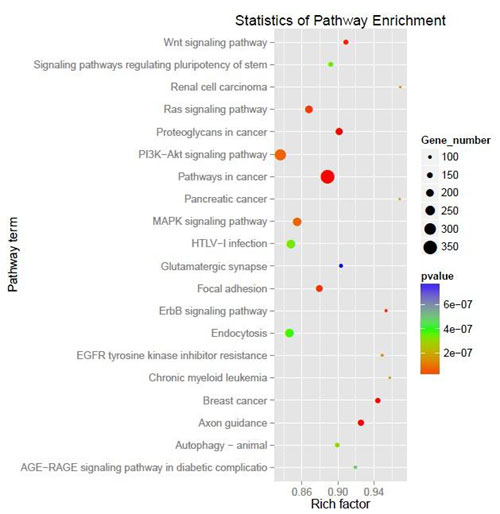 世界范围内约20%的癌症与病原菌感染相关。具核梭杆菌可以刺激上皮细胞转变为癌细胞导致癌症发生,但是此过程的具体发生机制是未知的。具核梭杆菌、大肠杆菌、 PBS分别处理HCT116和LoVo 细胞,发现具核梭杆菌处理明显促进两种肿瘤细胞系细胞增殖;具核梭杆菌处理的细胞在小鼠体内形成的肿瘤组织直径更大、更重。具核梭杆菌和PBS分别灌胃APC突变小鼠,具核梭杆菌灌胃的小鼠具有更多的腹腔积液、出现血性腹泻、肠道扩张和脾肿大症状,同时存活时间更短。解剖各组小鼠发现,小鼠肠道癌组织的数量更多,直径更大,同时癌细胞内增殖细胞核抗原表达上升血清炎症因子含量升高。具核梭杆菌和PBS分别分别处理四种结直肠癌细胞(CRC)系,miRNA芯片共鉴定102个差异表达miRNA,其中miR21差异最明显。细胞内敲低miR21表达后(miR21 inhibitors),细胞增殖和迁移能力受到抑制。通过多个数据库预测并结合荧光素酶报告基因实验,发现miR21的新靶基因RASA1。具核梭杆菌和PBS分别分别处理HCT118,KEGG 和 Reactome通路分析TLR4/MYD88/NFkB通路显著富集。并且NFkB亚基(P65、P50)磷酸化程度升高,TLR、 MYD88基因表达升高。沉默TLR4或MYD88可抑制NFkB的激活状态。
