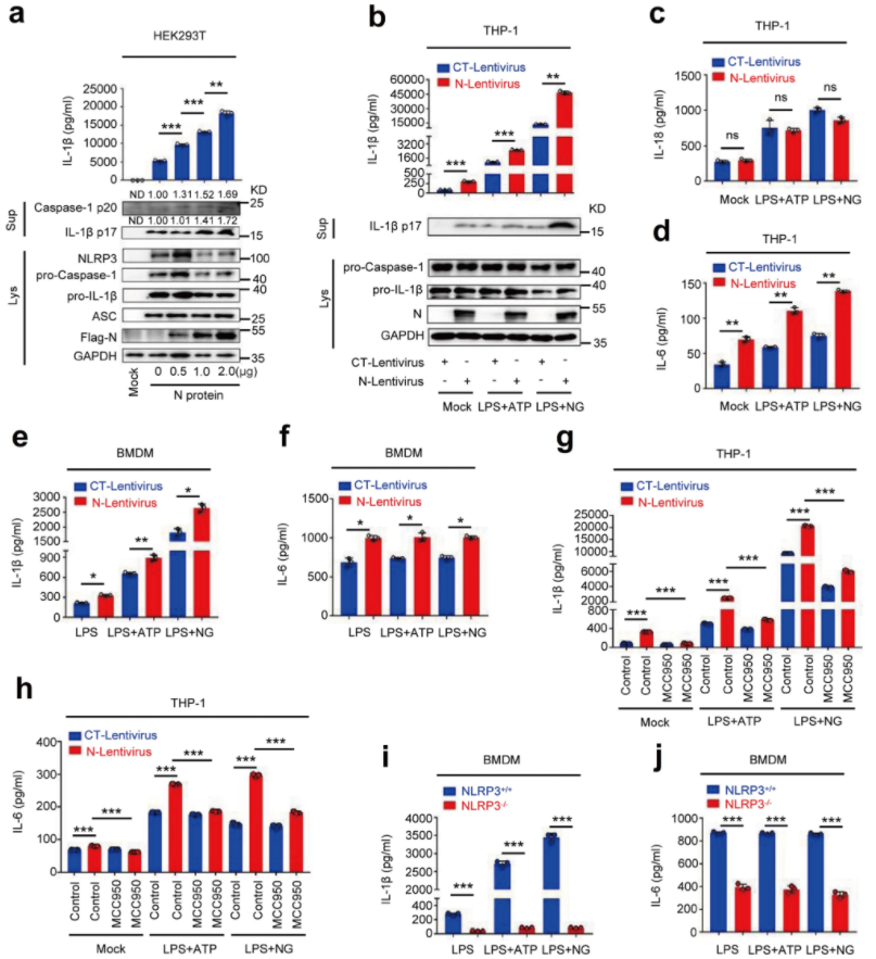 接下来研究人员对N蛋白在调节NLRP3炎症小体成分中的作用进行研究。结果显示,N蛋白对NLRP3、Caspase-1和ASC的蛋白水平没有影响,然而NLRP3存在时N和ASC可以相互免疫沉淀(Fig.5a-5e)。因此,该结果提示N蛋白、NLRP3和ASC三个蛋白可能形成一个复杂的N-NLRP3-ASC复合物。N蛋白增强NLRP3与ASC的相互作用在HEK293T和A549细胞并呈剂量依赖(Fig.5f-5g)。同样,在PMA-differentiated THP-1-N细胞中,Nigericin促进 N蛋白在NLRP3存在的情况下与内源性ASC相互作用(Fig.5h)。因此,CoV-2 N 促进NLRP3与ASC的相互作用。