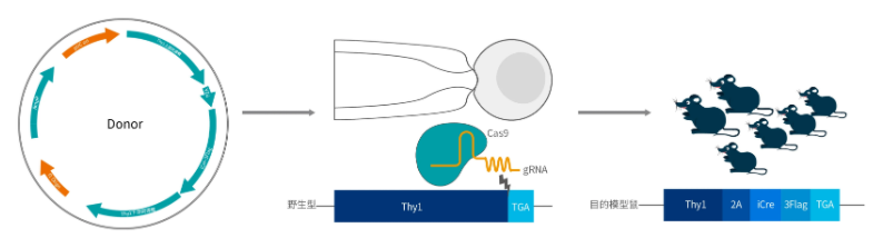 利用基因敲入手段,借助CRISPR/Cas9技术,将Cre重组酶定点插入到小鼠基因组中,获得可特异性在某类神经元中表达Cre的工具鼠,从而可以配合AAV-DIO病毒载体,做到精准操控神经元的目的,亦可以和多种Flox鼠搭配使用,研究不同基因的功能。