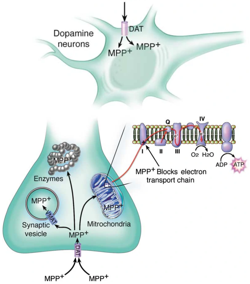 MPP+的结构接近多巴胺,因此会错误地被中脑多巴胺神经元膜上的多巴胺转运体(dopamine transporter, DAT)选择性重吸收进入细胞内6。而一旦进入细胞,MPP+则会“凶相毕露”,它会抑制线粒体呼吸链复合体I的活性7,从而阻断电子转移链,减少ATP的生成并促进活性氧(reactive oxygen species, ROS)的产生,最终造成神经元的损伤8。