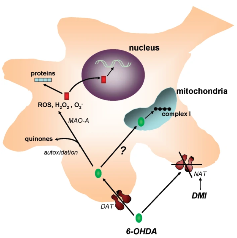 6-OHDA对神经元的毒害作用有一个“两步走”的过程。第一步是特异性地在多巴胺能神经元内的积累。由于6-OHDA的结构和儿茶酚胺类似,因此释放在细胞间质中的6-OHDA会被多巴胺神经元胞体或突起上的多巴胺转运体错误地识别并重吸收进入细胞(图2)。第二步则是细胞毒性。当6-OHDA进入神经元后,一方面将会被单胺氧化酶-A(MAO-A)催化形成过氧化氢(H2O2)。过氧化氢本身具有很强的细胞毒性,同时也会触发氧自由基的形成12。而另一方面,自动氧化(autooxidation)作用所大量产生的活性氧和醌类产物超出了细胞内抗氧化酶的承受能力,导致细胞结构和代谢的紊乱,最终结果就是神经元的损伤(图2)。