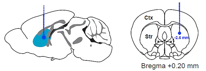 与MPTP不同的是,6-OHDA并不能穿透血脑屏障。因此为了达到中枢神经系统毁伤的效果,在使用6-OHDA进行帕金森造模时需要使用脑立体定位注射技术将6-OHDA注入到黑质-纹状体(striatonigral)这一多巴胺能投射通路中。具体的注射位点可以是黑质致密部(substantia nigra pars compacta, SNpc)、纹状体(striatum)或者位于二者之间的前脑内侧束(MFB)。