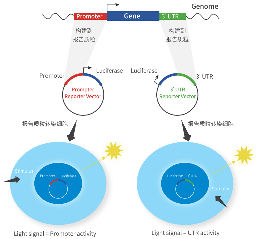 ● 分析信号通路是否激活。将该信号通路的下游响应原件序列构建入报告基因载体,在不同上游信号条件下,萤光素酶活性代表了通路的下游响应。