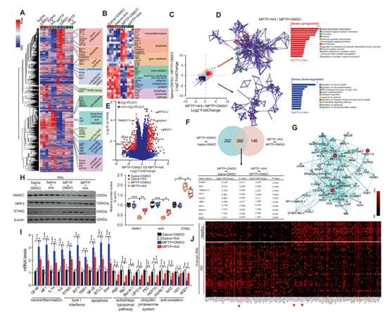 为了破解WA发挥神经保护作用的分子机制。研究者采用全转录组测序的手段检测了WA处理的帕金森小鼠黑质区各相关基因表达变化。测序结果提示,WA上调了多种与多巴胺合成、线粒体功能相关基因的表达,并稳定了MPTP导致的氧化应激、神经炎症相关基因的改变。进一步分析表明,与干扰素刺激因子(stimulator of interferon genes,STING)相关的基因在MPTP诱导的模型小鼠的黑质中发生了高水平的改变,而WA处理则可以部分恢复这些基因表达的变化。这提示STING可能作为WA作用的重要分子靶点。STING是免疫相关的因子,可以被外源性的DNA或内源的线粒体DNA激活而导致免疫反应产生。生物信息学分析提示,帕金森相关基因DJ1和抗氧化因子Nrf2k可能与STING存在互作(图3G)。而针对帕金森患者黑质组织测序结果的荟萃分析(meta-analysis)也表明这三个因子在帕金森病中发生了改变(图3J)。因此以上结果提示STING相关通路可能参与了帕金森病的病理过程,而DJ1、Nrf2、STING则可能是WA发挥神经保护作用中的重要靶点。