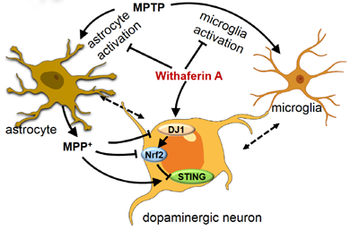 醉茄素A(Withaferin A, WA)是从南非醉茄中分离出的一种甾体内酯类成分。醉茄素A被报道具有广泛的抗炎、抗氧化效应,在多种神经系统疾病中均表现出了良好的保护作用。然而,醉茄素A发挥神经保护作用的分子靶点和分子机制仍不明确。在本文中,北京大学郑瑞茂教授团队在不同的帕金森病动物模型中分别验证了醉茄素A对中脑多巴胺神经元的保护作用。使用高通量测序结合生物信息学手段,作者鉴定并验证了DJ1-Nrf2-STING通路作为WA的靶点介导了WA抗帕金森病变的功能。本文阐明了醉茄素A治疗帕金森病的分子机制,提示醉茄素A作为抗帕金森病药物的线索。