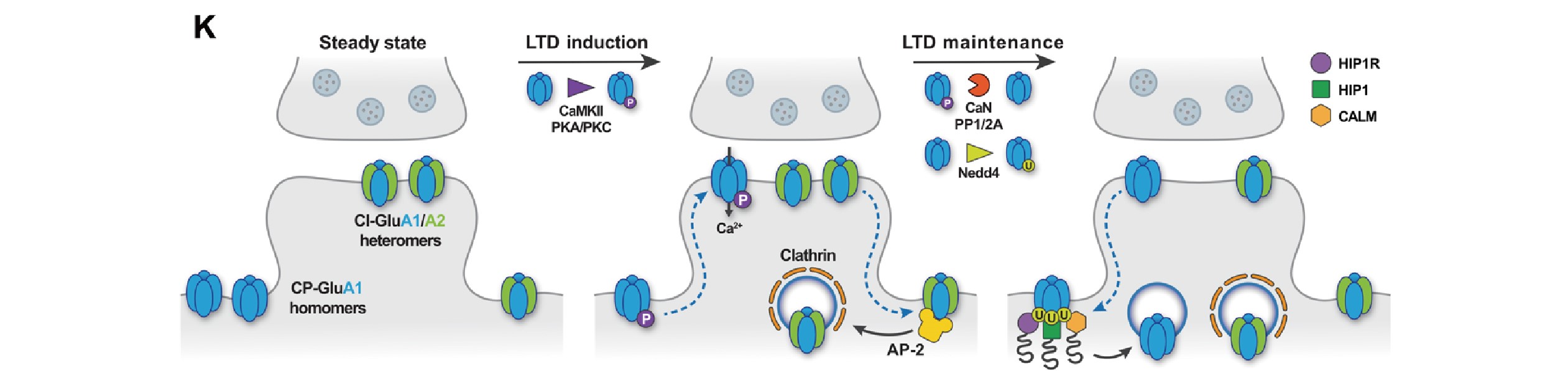 在LTD发生过程中,含有GluA1/A2异聚体的钙不通透性AMPAR(CI-AMPARs)会通过网格蛋白介导的内吞作用进行内化,而含有GluA1同聚体的钙通透性AMPAR(CP-AMPARs)先被招募到突触,介导了钙内流。在LTD维持阶段,这些CP-AMPARs最终需要被移除,然而移除机制暂不明确。