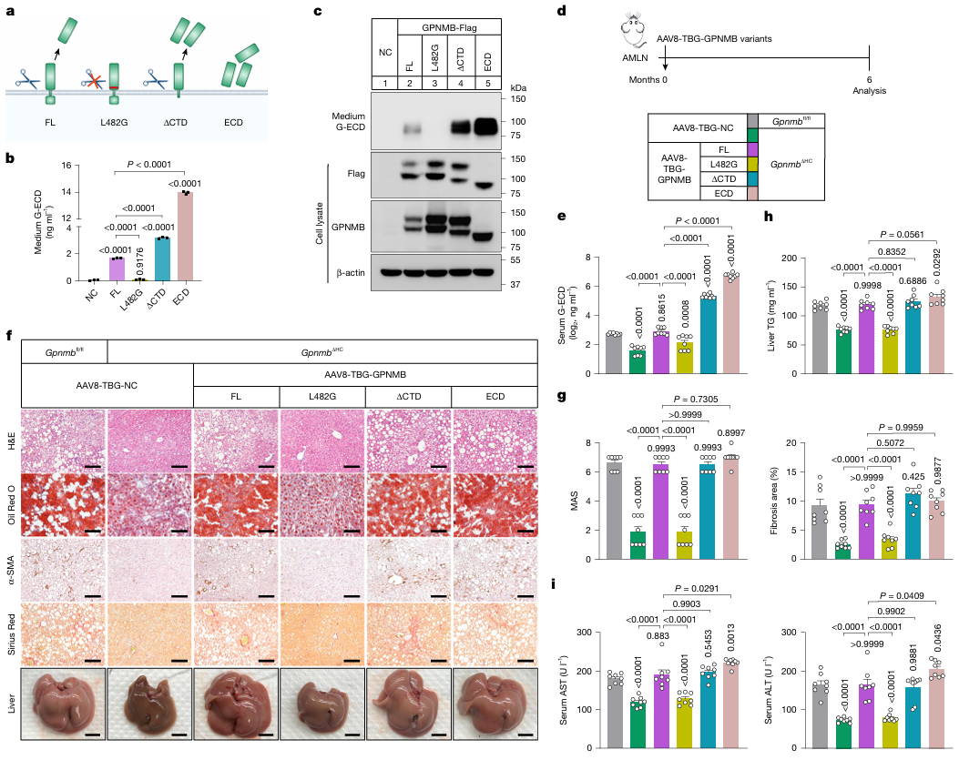 GPNMB作为I型跨膜糖蛋白,经蛋白水解切割可释放G-ECD,研究发现L482G点突变可显著抑制G-ECD的分泌,成为抗脱落突变体。进一步在Gpnmb敲除小鼠中重构不同形式的GPNMB突变体,发现全长GPNMB、胞内域缺失体(ΔCTD)和G-ECD均可恢复血清G-ECD水平并逆转Gpnmb敲除对MASH的保护作用,而抗脱落的L482G突变体无此效应,且过表达G-ECD的小鼠MASH症状进一步加重。同时,人类MASH患者血清G-ECD水平显著升高并与疾病严重程度相关,证实分泌型G-ECD是GPNMB驱动MASH的关键功能形式。