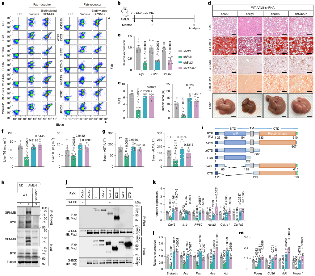 为寻找G-ECD发挥作用的膜受体,研究利用细胞表面展示文库进行筛选,结合肝脏表达验证和定位分析,锁定RYK、BST2和CD207三个候选分子,进一步实验发现仅RYK(受体酪氨酸激酶样孤儿受体)敲低可显著改善AMLN饮食诱导的MASH。免疫共沉淀实验证实了肝脏中GPNMB与RYK的内源性相互作用,且G-ECD主要结合RYK的胞外WIF结构域。肝细胞特异性敲低或敲除Ryk基因,可显著减轻MASH病变,并完全消除G-ECD的致病作用。