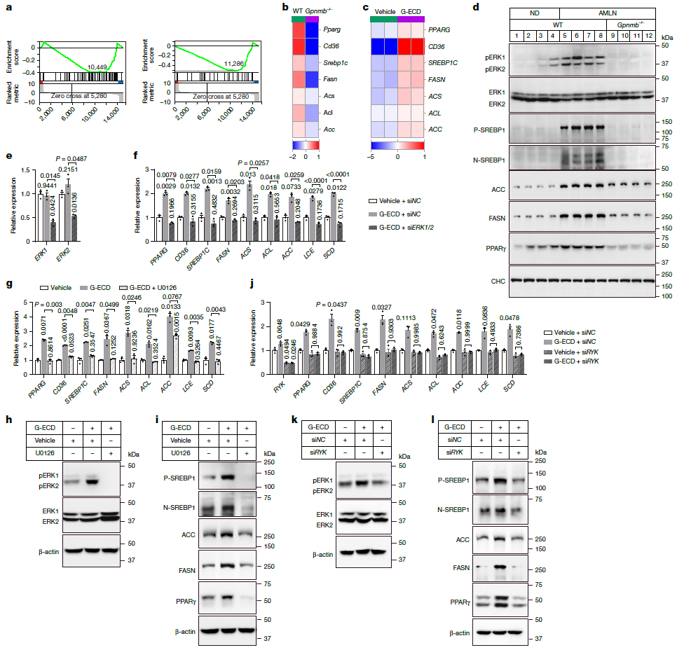 研究进一步解析GPNMB–RYK轴的下游分子机制。RNA测序和功能实验显示,Gpnmb或Ryk敲除均显著下调肝脏脂代谢通路相关基因,而G-ECD处理可显著诱导PPARγ、CD36及SREBP1C通路脂生成基因的表达。通过报告基因系统筛选发现,G-ECD与RYK结合可特异性激活血清反应元件(SRE),提示ERK1/2信号通路参与调控。AMLN饮食可激活野生型小鼠肝脏ERK1/2信号,而该效应在Gpnmb敲除小鼠中完全消失,且ERK1/2抑制剂(U0126)或siRNA敲低可显著抑制G-ECD诱导的脂代谢基因表达。此外,G-ECD处理可快速激活ERK1/2磷酸化,并上调SREBP1、ACC、FASN和PPARγ的蛋白表达,而RYK敲低可阻断这一过程。研究证实GPNMB–RYK轴通过激活ERK1/2信号,转录激活PPARγ-CD36和SREBP1C通路,促进肝脏脂肪酸摄取和从头脂生成,最终驱动MASH发生。