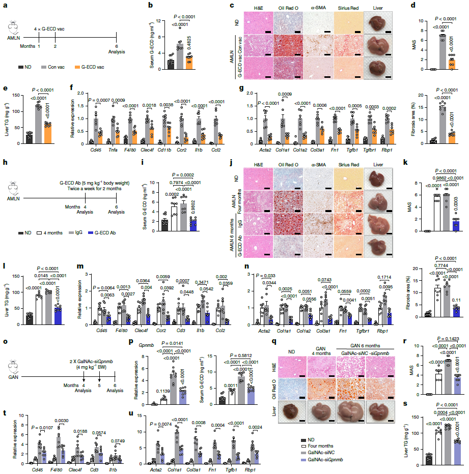 基于上述机制发现,研究团队探索了靶向GPNMB–RYK轴防治MASH的多种策略,均取得了显著效果。在预防层面,利用G-ECD疫苗可诱导小鼠产生高滴度抗体,有效清除血清G-ECD,显著抑制AMLN饮食诱导的MASH发生,同时改善小鼠全身代谢异常。在治疗层面,针对已建立的MASH模型,利用AAV8-shGpnmb敲低、G-ECD中和抗体以及肝细胞靶向的GalNAc-siGpnmb均能显著降低肝脏GPNMB表达和血清G-ECD水平,逆转肝脏脂肪变性、炎症和纤维化,改善代谢紊乱,其中GalNAc-siGpnmb作为临床已验证的靶向递送技术,展现出良好的转化前景。以上干预手段均在不显著影响体重和食欲的前提下,改善了肝脏病理和全身代谢状态。